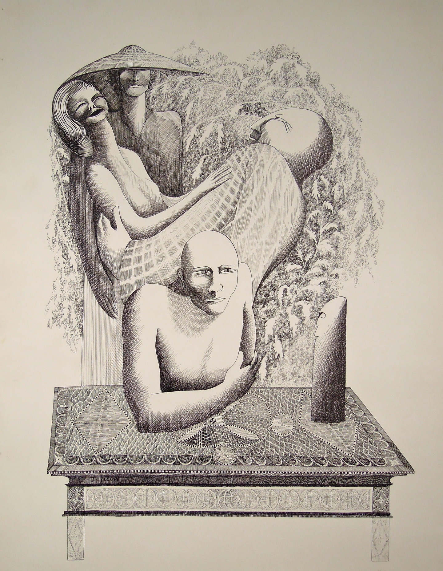 Dessin à l'encre de Chine, Calame, plume, rehaussé de La-Vis